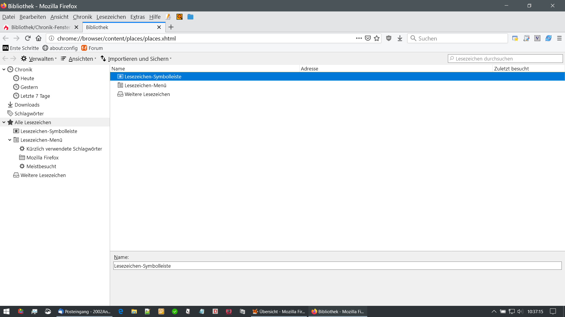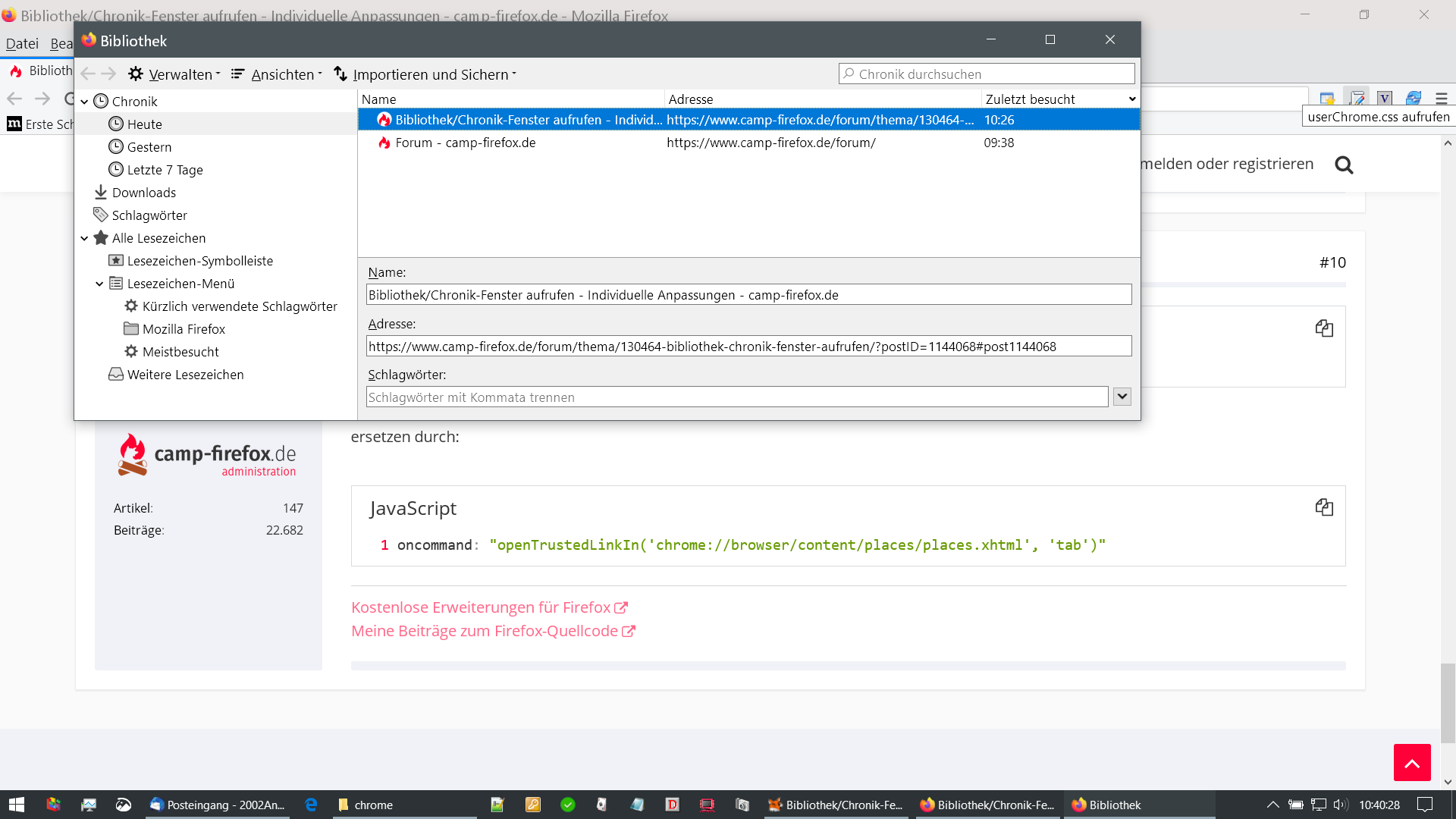 ich möchte mir per Klick auf ein Symbol die gesamte Firefox-Chronik anzeigen lassen (das Fenster Bibliothek/Chronik müsste dann wohl öffnen). Geht das irgendwie?