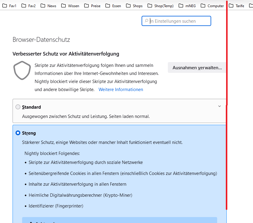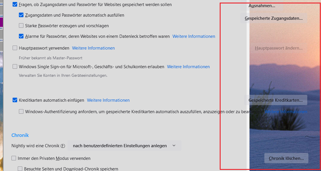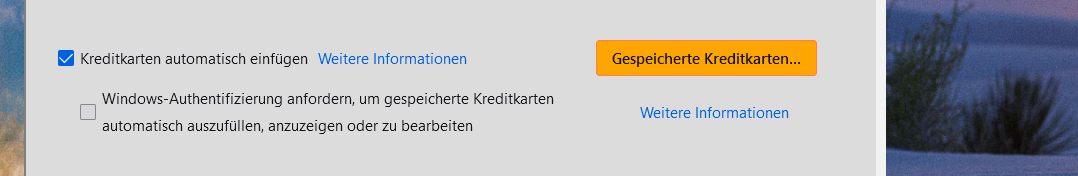 Ab Version 99 (aktueller Nightly) gibt es in about:preferences unter Datenschutz & Sicherheit einen neuen Block für Kreditkarten.