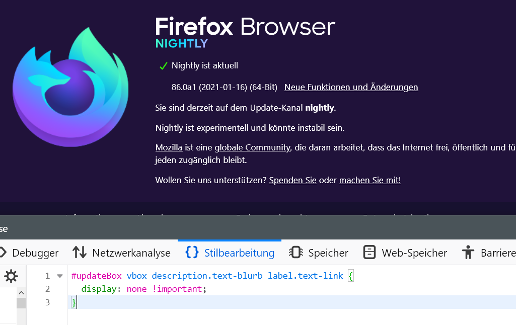 • Meine Versuche den Hintergrund bei about:preferences zu ändern bringen nicht den erwarteten Erfolg, weil ich die richtigen Selektoren dazu nicht finde.
