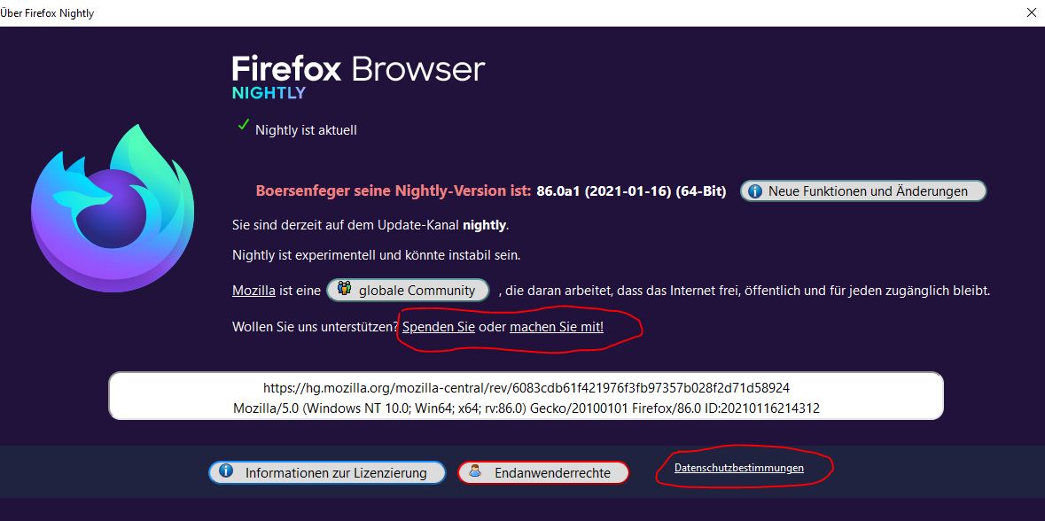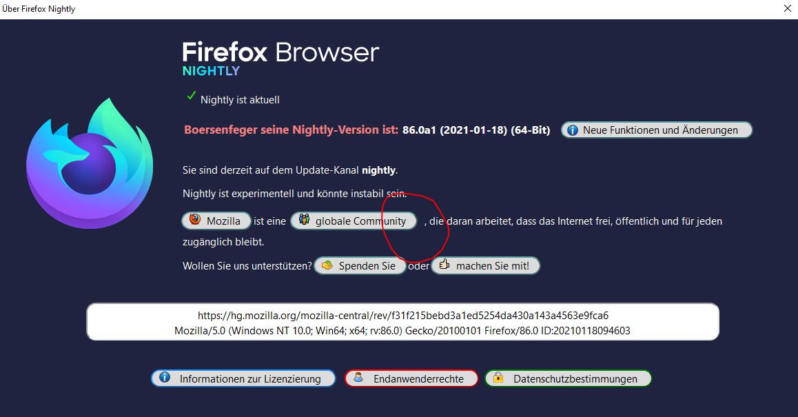 • Kann das mal bitte überprüft werden, denn im Nightly scheint es einen Fehler im Dialog zu geben. Beim Start befindet sich der Button etwa auf dem Bereich des roten Feldes, und springt dann in kurzer Zeit nach links. Das habe ich nun wiederholt festgestellt, nicht nur in einer Version.