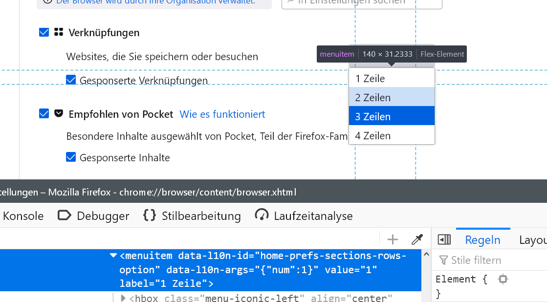 Wie kann ich in about:preferences die drop-down menüs im offenen Zustand anpassen?
