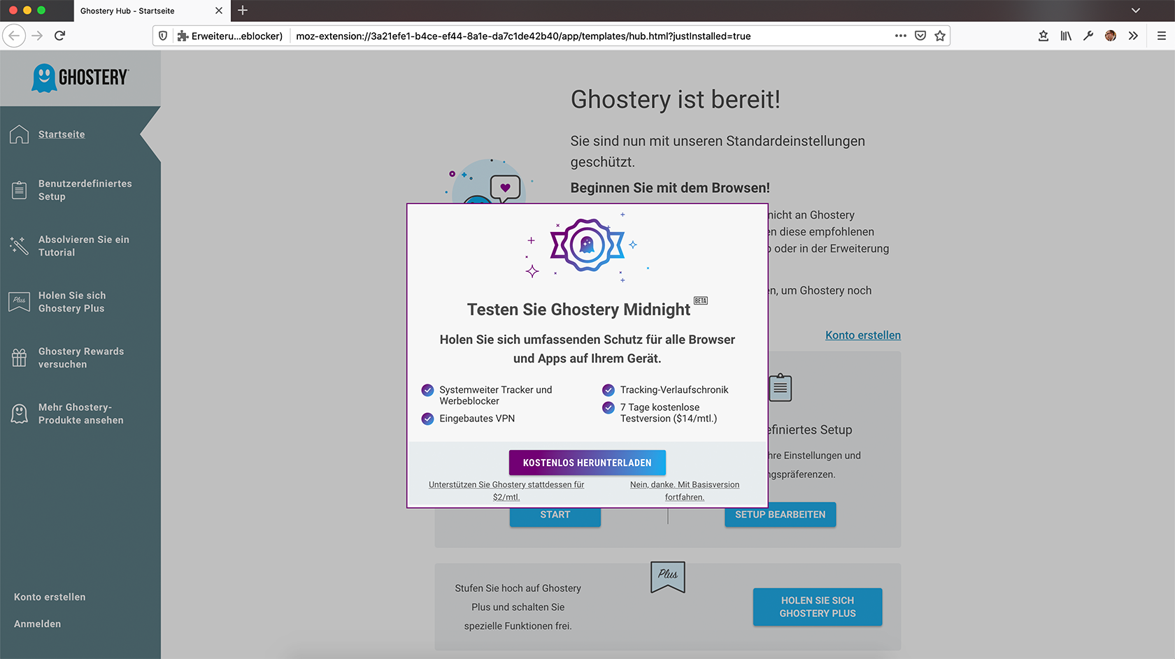 Hallo, seit langer Zeit lief das Addon "Ghostery" unauffällig im Hintergrund bei den unterschiedlichen Firefox-Versionen. Dann wurde darauf aufmerksam gemacht, dass mit einer kostenpflichtigen "Pro-Version" verschiedene Zusatzfunktionen nutzbar sein würden. Schließlich, vor einigen Wochen, erschien dann bei jedem ersten Start irgendeiner Seite ein Popup mit einem Hinweis auf eine Pro-Version. Das Popup konnte weg geklickt werden. Neuerdings meldete sich Ghostery mit einer penetranten unerträglichen fensterfüllenden Werbefläche für die kostenpflichtige Pro-Version ! Die war auch nicht mehr zu entfernen. Ich habe also vorläufig das Addon entfernt.