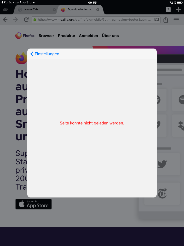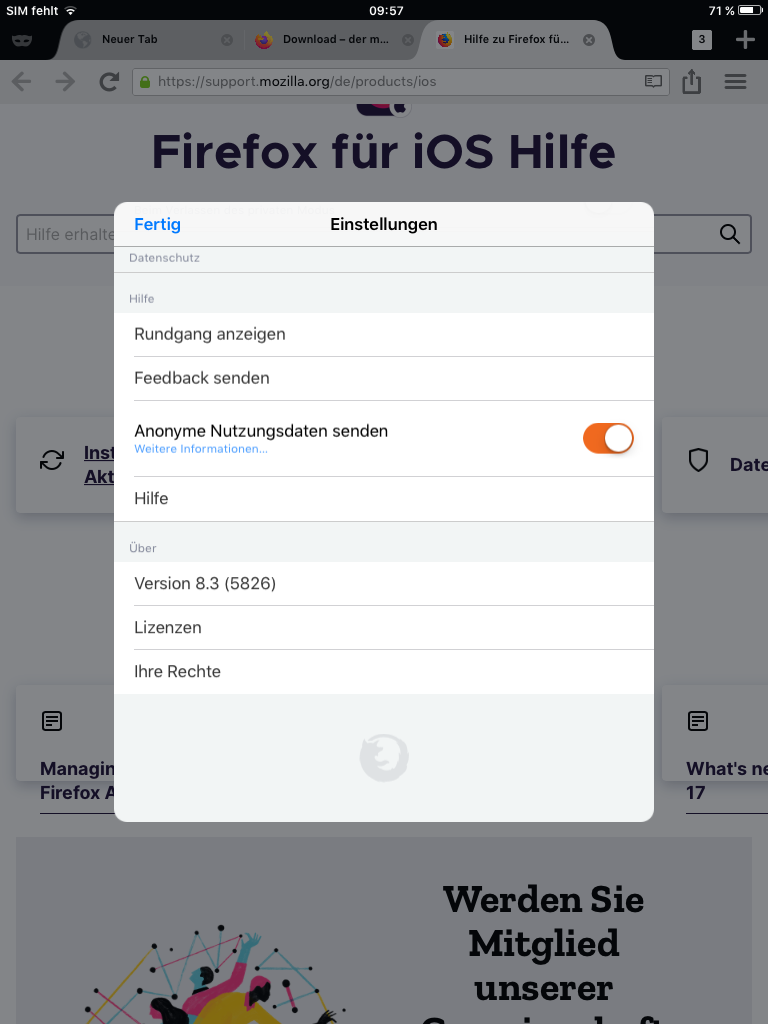 deine Angaben passen nicht. Firefox 25.1 für iOS erfordert iOS 11.4 oder höher. Du kannst also gar nicht Firefox 25.1 auf iOS 9.3.5 nutzen. Vor allem besagt dein dritter Screenshot ja auch, dass du Firefox 8.3 und nicht Firefox 25.1 installiert hast. Das ergibt auch Sinn, denn das war die letzte Version, welche auf iOS 9.3.5 noch lief.