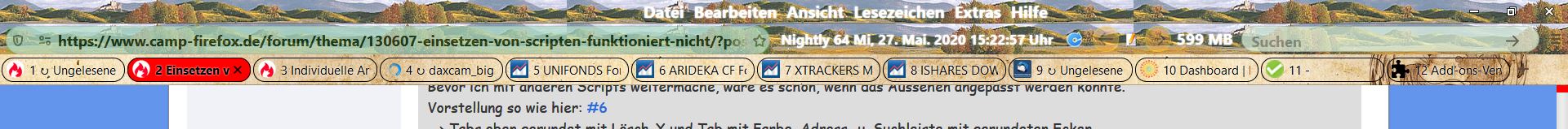 Erfreulich: Es funktionieren jetzt A-Statusleiste.uc.js (Version von Andreas) u. Tabs runter.uc.js (von hier: #2) unterhalb der Lesezeichen-Leiste. Bis dahin zunächst vielen Dank!