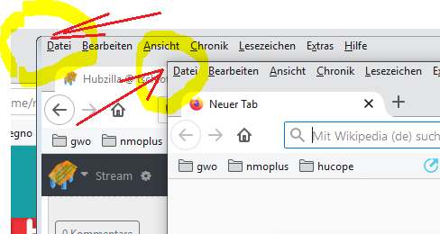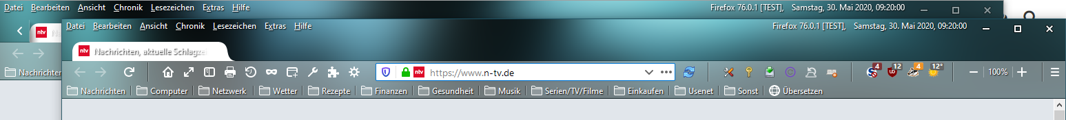 ich brauche keine Lösung, bin einfach neugierig, wie es sein kann, dass beim Klon - rechts im Bild - den ich mit "Datei -> Neues Fenster" oder "Ctrl +N" erstelle, die lnke Ecke oben nicht abgerundet ist.