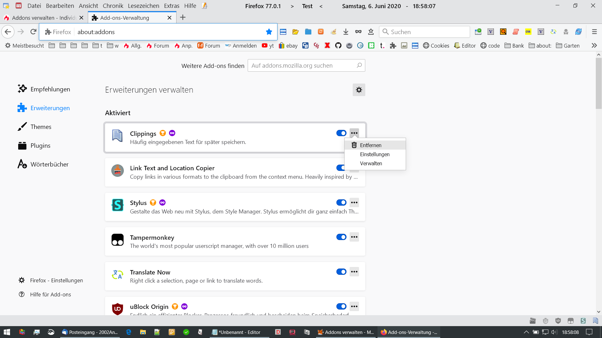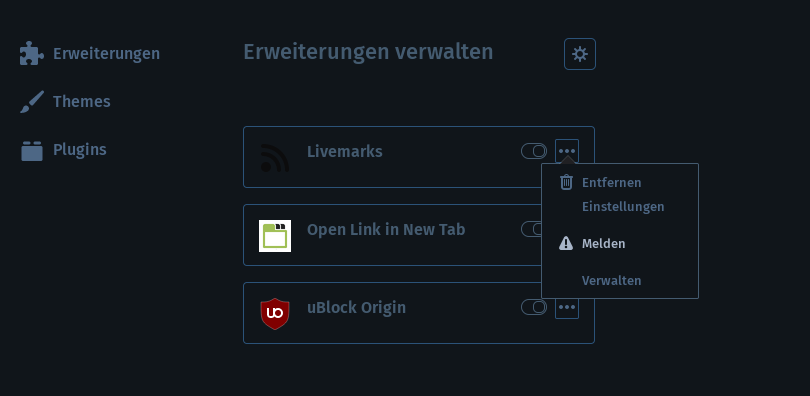 Wenn ich den Manager aufrufe, sehe ich die installierten Addons mit dem Button "drei Punkte", die zum erweiterten Menü führen.