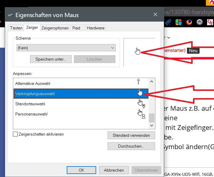Weder unter W10 prof noch unter FF habe ich eine Möglichkeit zur Änderung gefunden- Auch nicht bei den Einstellungen zur"Maus". Die "Hand" erscheint auch z.B. wenn ich hier auf der Seite die Maus über "Antworten" oder "Vorschau" bewege.