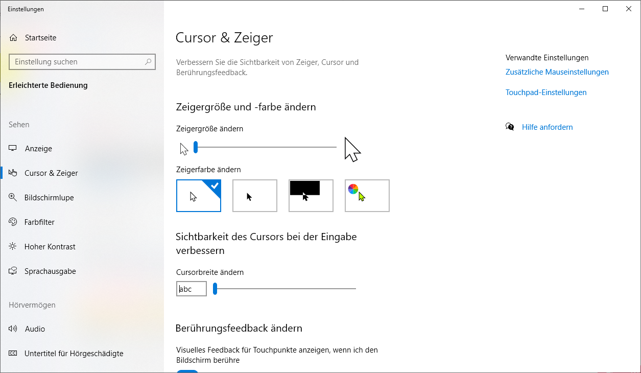 die "Mauszeigergröße ändern" klickst du an und dann kannst du dort die Zeigergröße und Farbe ändern