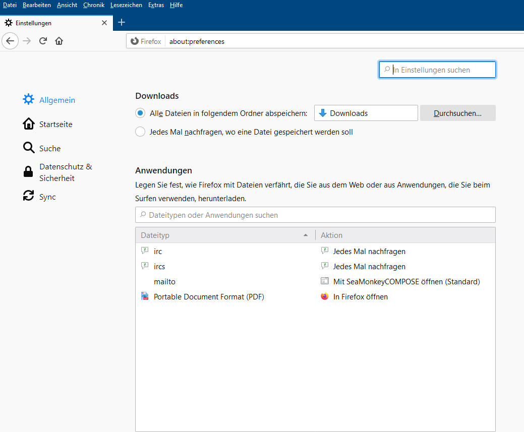 Das was hier https://support.mozilla.org/de/kb/einstell…nen-von-dateien beschrieben wird hilft mir nicht, da diese Abfrage nicht kommt. Es wird einfach ein neuer leerer Tab geöffnet wo Chrome/Chromium mit dem Download beginnen.