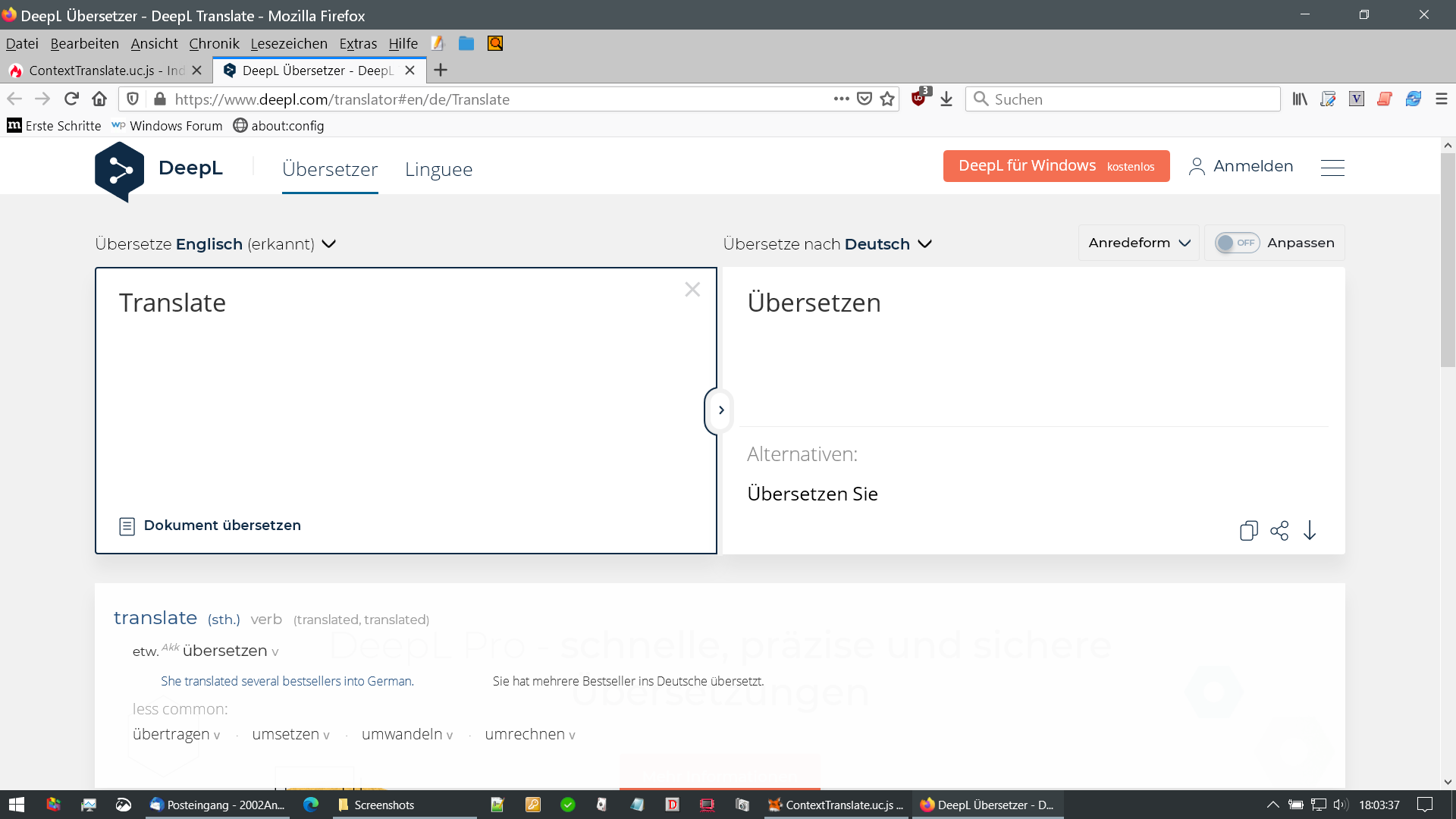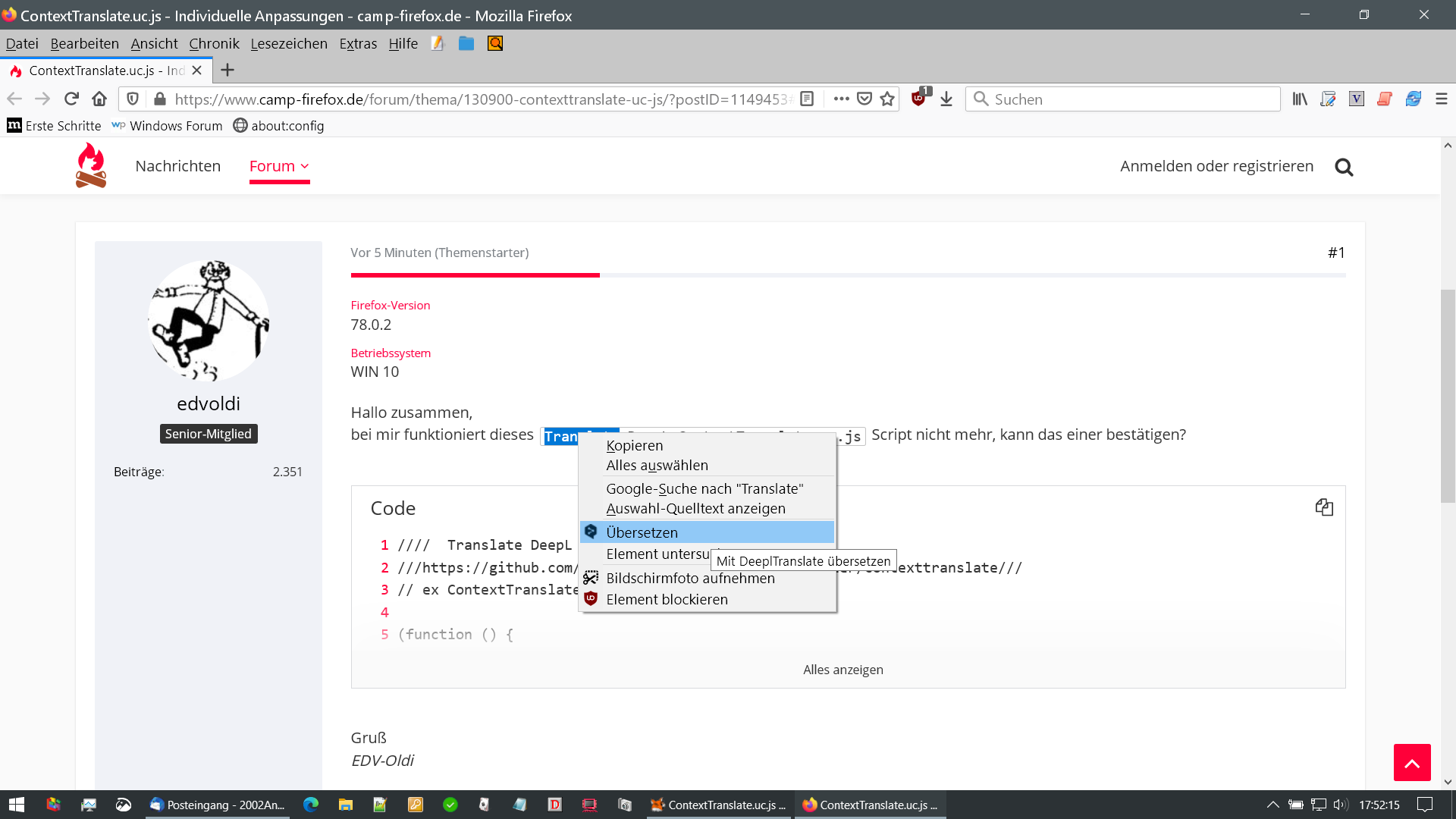 bei mir funktioniert dieses Translate DeepL ContextTranslate.uc.js Script nicht mehr, kann das einer bestätigen?