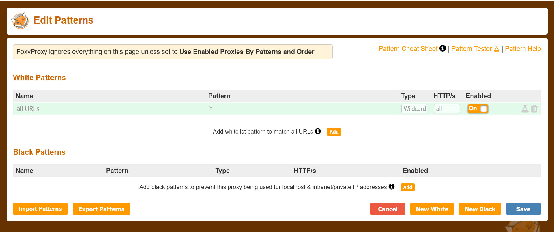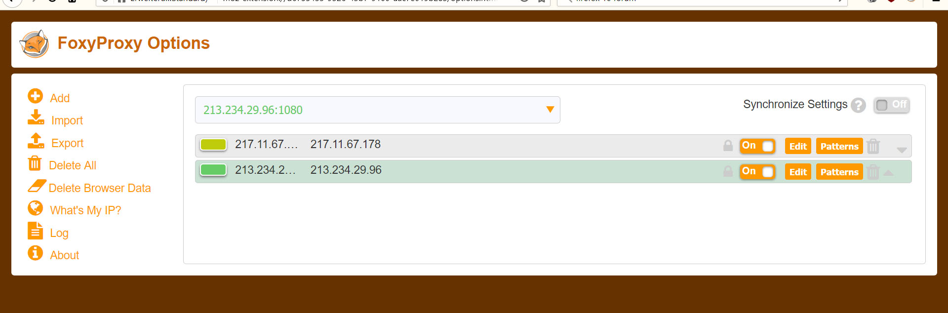 ob ich im drop-down von FoxyProxy einen Proxy wähle oder "Use enabled Proxys by pattern and order" macht keinen Unterschied;