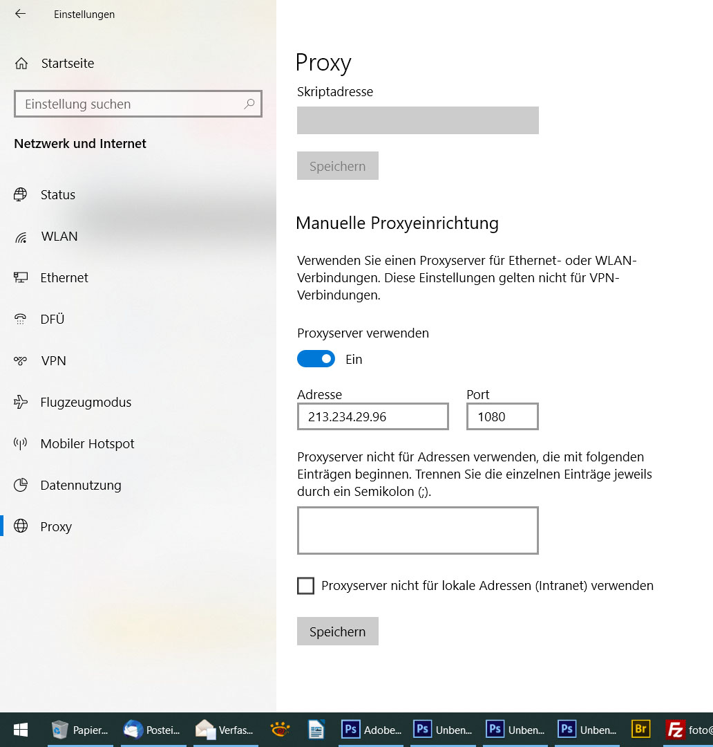 Ich habe dann versucht, den Proxy systemweit in den Windows-Einstellungen einzurichten, aber das klappt auch nicht, es kommt die gleiche Meldung;