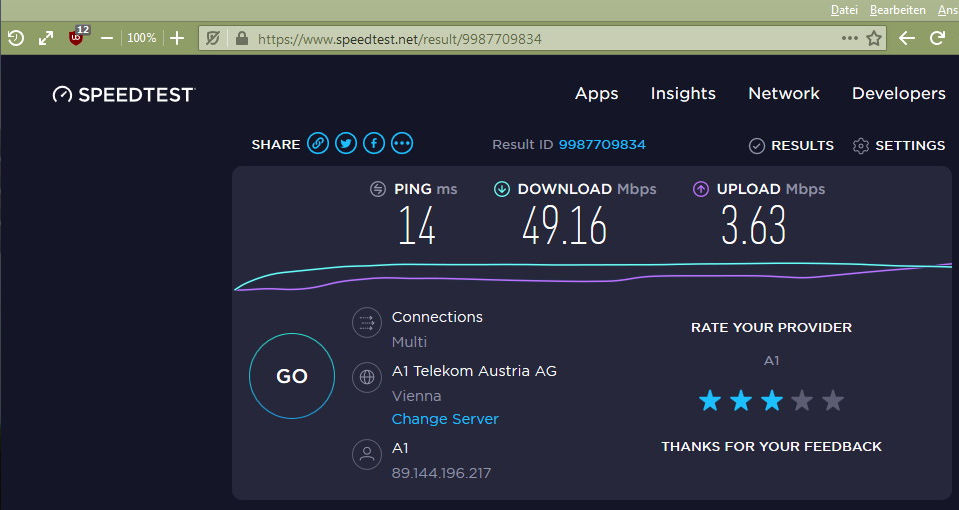 Keine Besserung. Dann die Überraschung: Mit dem Browser Opera habe ich Werte von unglaublichen 433 mbit/s (der höchste Wert), mit zwei anderen Messanbietern Werte zwischen 345 bzw. 387 mbit/s. erreicht. Was sagt mir das? Firefox ist nicht mehr das was er mal war??....Die Messwerte bei FF fielen rapide vor 6 Wochen. Zu der Zeit hatte ich noch Windows 8.1 installiert. Alles lief einwandfrei. Ich habe auch den Versuch gestartet, nach Installation des neuen Betriebssystems und nach Installation von Firefox (ohne irgendwelche Zusatz-Adds) die Geschwindigkeitsmessung durchzuführen. Am Ergebnis hatte sich nichts geändert....