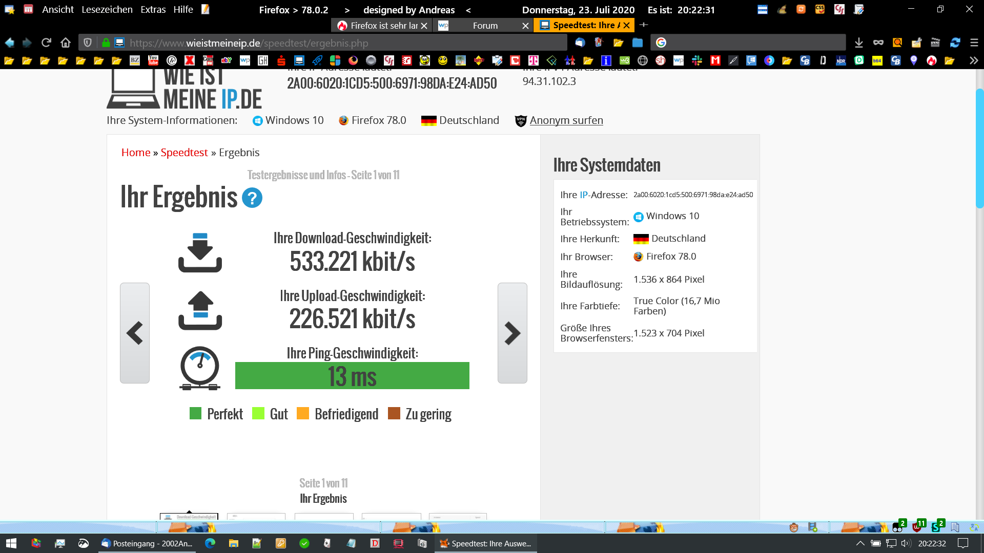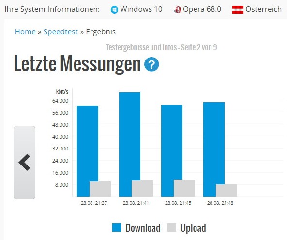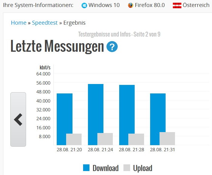 Keine Besserung. Dann die Überraschung: Mit dem Browser Opera habe ich Werte von unglaublichen 433 mbit/s (der höchste Wert), mit zwei anderen Messanbietern Werte zwischen 345 bzw. 387 mbit/s. erreicht. Was sagt mir das? Firefox ist nicht mehr das was er mal war??....Die Messwerte bei FF fielen rapide vor 6 Wochen. Zu der Zeit hatte ich noch Windows 8.1 installiert. Alles lief einwandfrei. Ich habe auch den Versuch gestartet, nach Installation des neuen Betriebssystems und nach Installation von Firefox (ohne irgendwelche Zusatz-Adds) die Geschwindigkeitsmessung durchzuführen. Am Ergebnis hatte sich nichts geändert....
