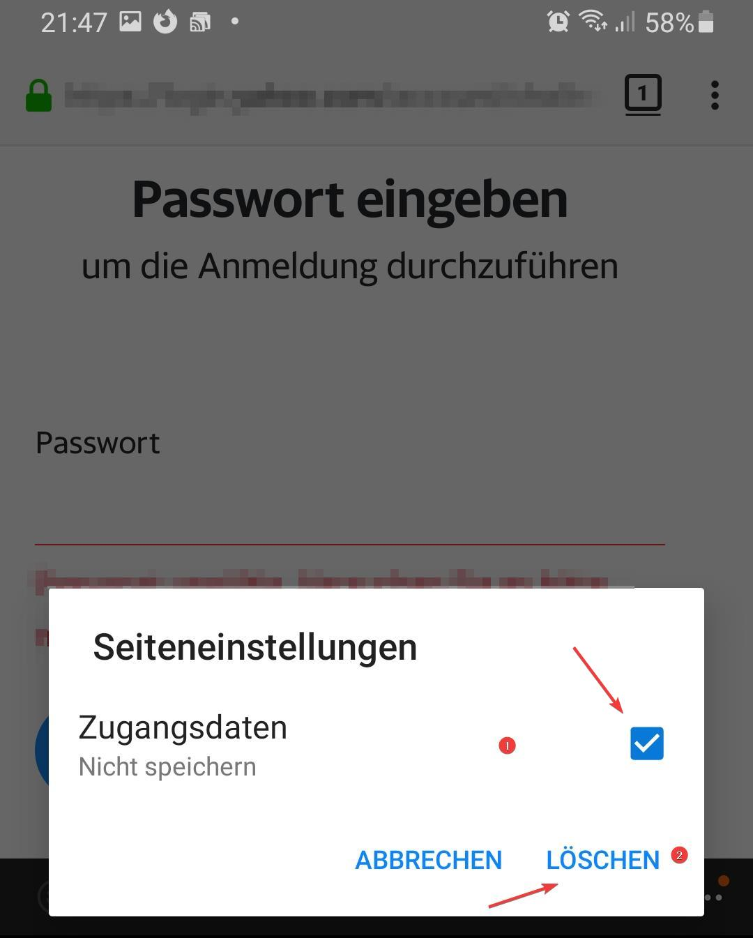 Du musst auf der besagten Webseite auf das grüne Schloss in der Adressleiste tippen ➡ danach sollte ein kleines Fenster aufgehen, wo du die Option hast auf Seiteneinstellungen bearbeiten zu tippen. ➡ Danach im nächsten Fenster Zugangsdaten (Nicht Speichern) auswählen und danach auf Löschen tippen.