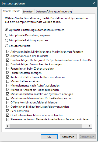 Edit: Habe gerade festgestellt, dass die globale Einstellung der Windows-Animationen unter "Erleichterter Bedienung", auch den Eintrag "Steuerelemente und Elemente innerhalb von Fenstern animieren" unter den Einstellungen zu den visuellen Effekten steuert. Von daher hat sich also an der Ausgangslage gar nichts verändert...