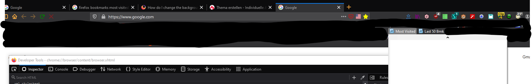 Es geht um die Einträge "Most Visited" und "Last 50 Bmks" in der Persönlichen Lesezeichen-Leiste. Diese werden beim dunklen Thema nicht mit dunklem HIntergrund und weißer Schrift angezeigt, sondern hellgrau mit schwarzer Schrift. Also ähnlich wie bei Klick auf ein Menü der Menü-Leiste.