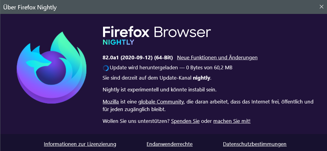 ich wollte gestern auch mal mein portables nightly per Upater auf den nächsten Stand bringen. Dies klappte bei mir auch nicht. Habe es dann manuell gemacht und heute klappt es auch wieder mit dem "Hilfe--> Über Nightly" es zu aktualisieren.