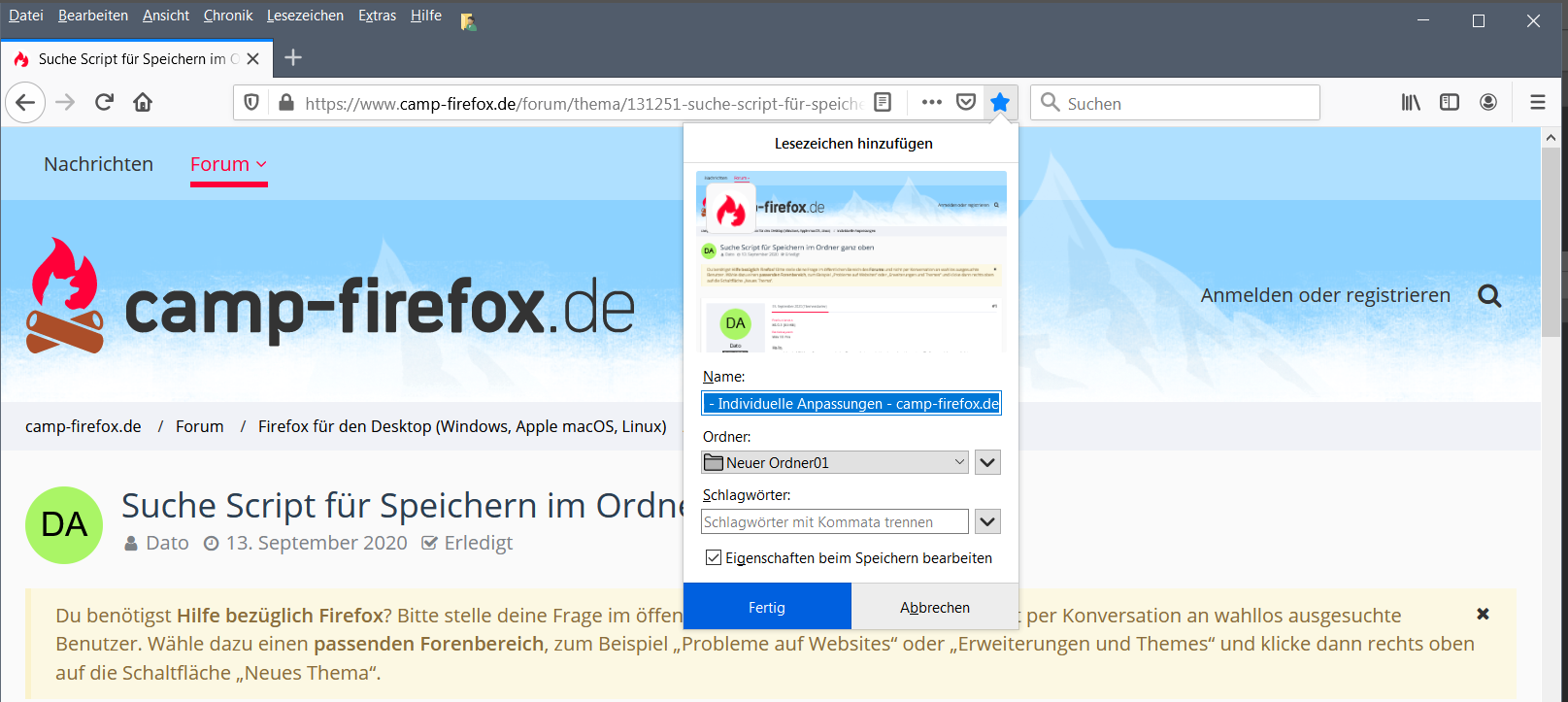 Nur mal so: Um ein Lesezeichen abzuspeichern, reicht ein Klick auf den Stern. Mit dem Häkchen kommt auch dort das Fenster Lesezeichen bearbeiten.