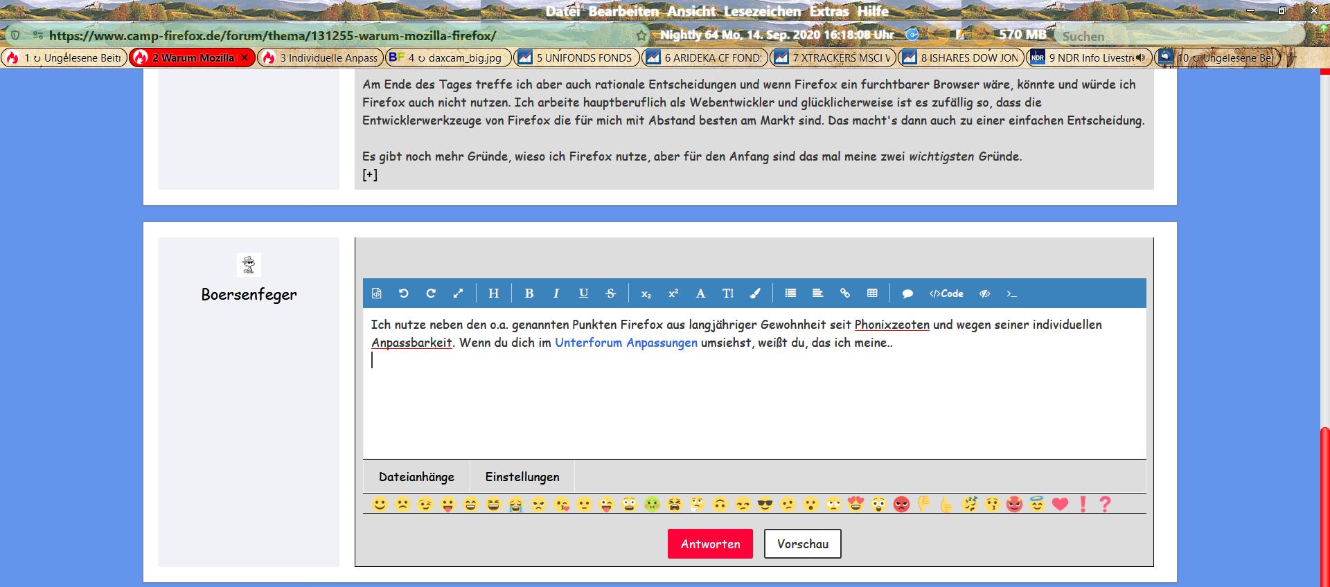 Am Ende des Tages treffe ich aber auch rationale Entscheidungen und wenn Firefox ein furchtbarer Browser wäre, könnte und würde ich Firefox auch nicht nutzen. Ich arbeite hauptberuflich als Webentwickler und glücklicherweise ist es zufällig so, dass die Entwicklerwerkzeuge von Firefox die für mich mit Abstand besten am Markt sind. Das macht's dann auch zu einer einfachen Entscheidung.