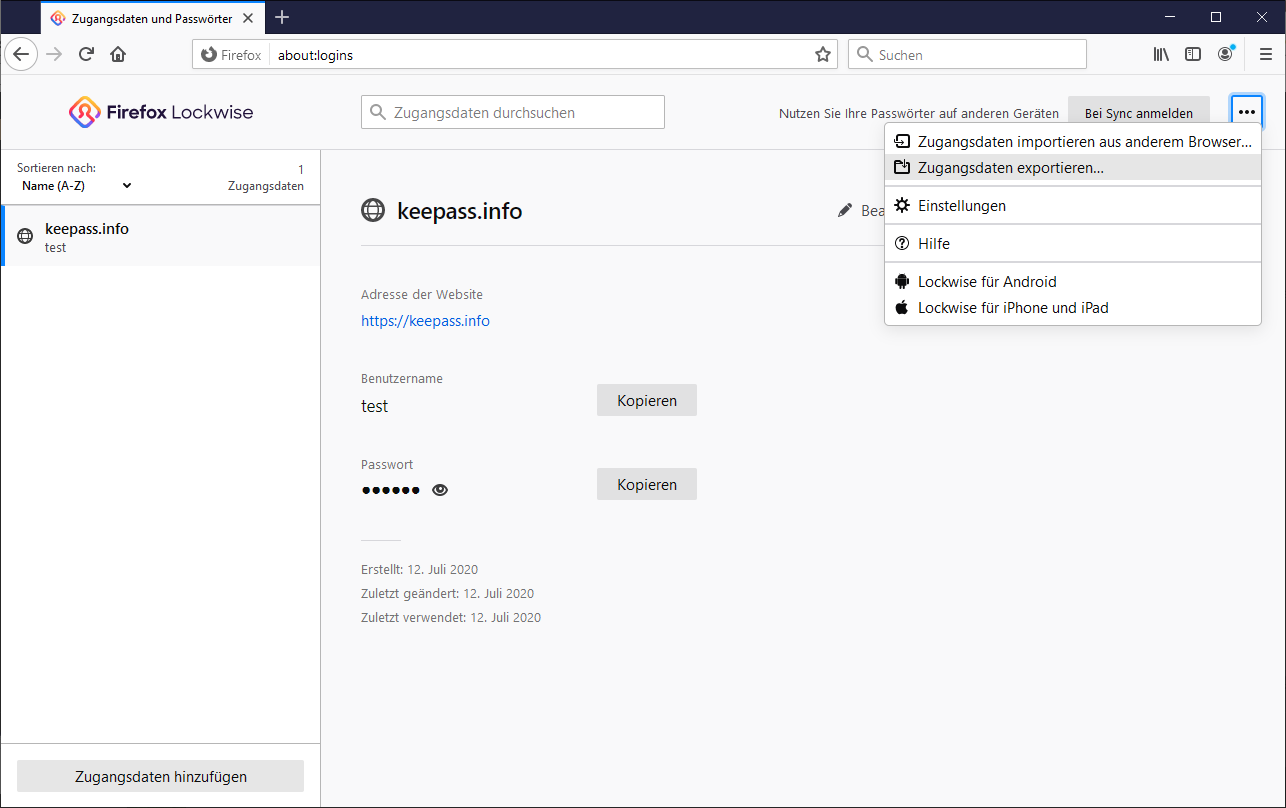 Das Feature steht erst ab Firefox 79 zur Verfügung, noch nicht in Firefox 78. Ab Firefox 80 ist dann auch der umgekehrte Weg, ein Import aus einer CSV-Datei, möglich.