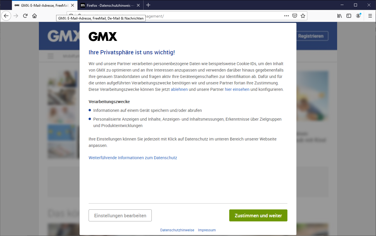 seit einigen Tagen (evtl. seit Update auf 81.0) friert die GMX-Login Seite ein und ist unscharf. Vorher wird kurz der Google Datenschutz-Hinweis angezeigt, ist aber gleich wieder weg. Nach nochmaligem Aufruf ist sie scharf und ich kann auch scrollen. Passiert nur bei GMX, alle anderen Lesezeichen werden einwandfrei geladen, ebenso verhält es sich beim Edge und beim IE.