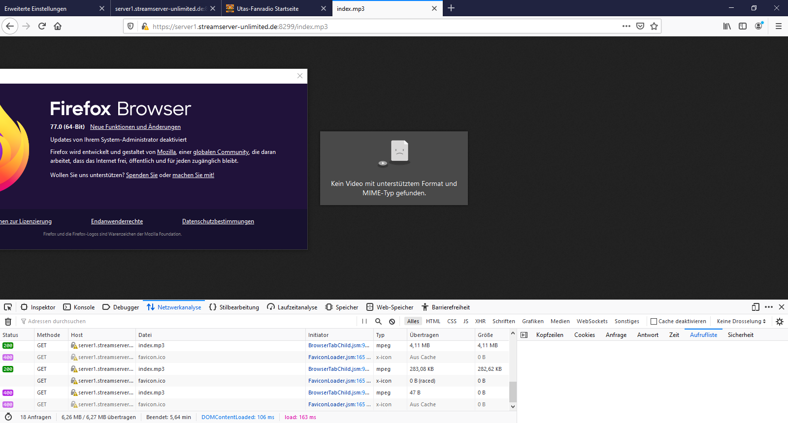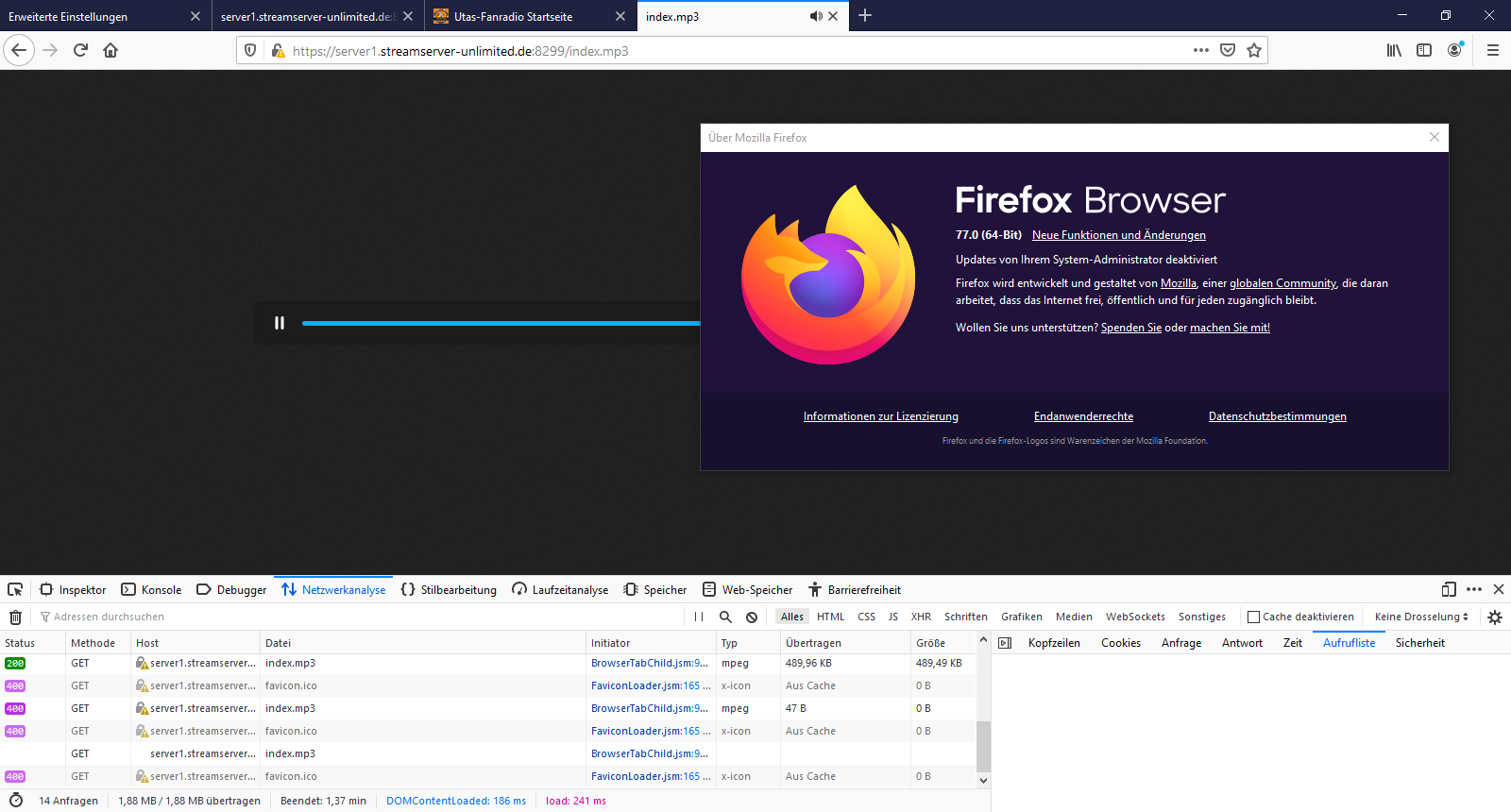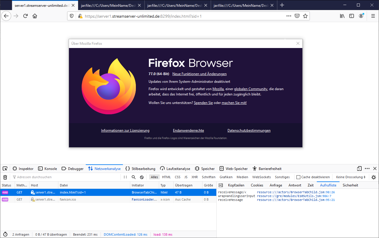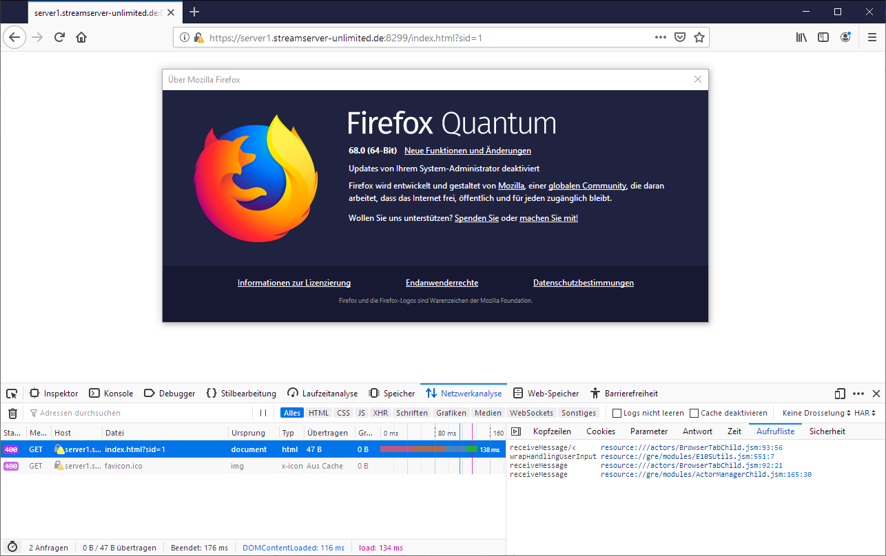 • Hab mal ein .gif gemacht, mit eingeschalteter Werkzeugleiste (F12) und der Aufrufliste (getestet mit Adresse https://server1.streamserver-unlimited.de:8299/index.html?sid=1)