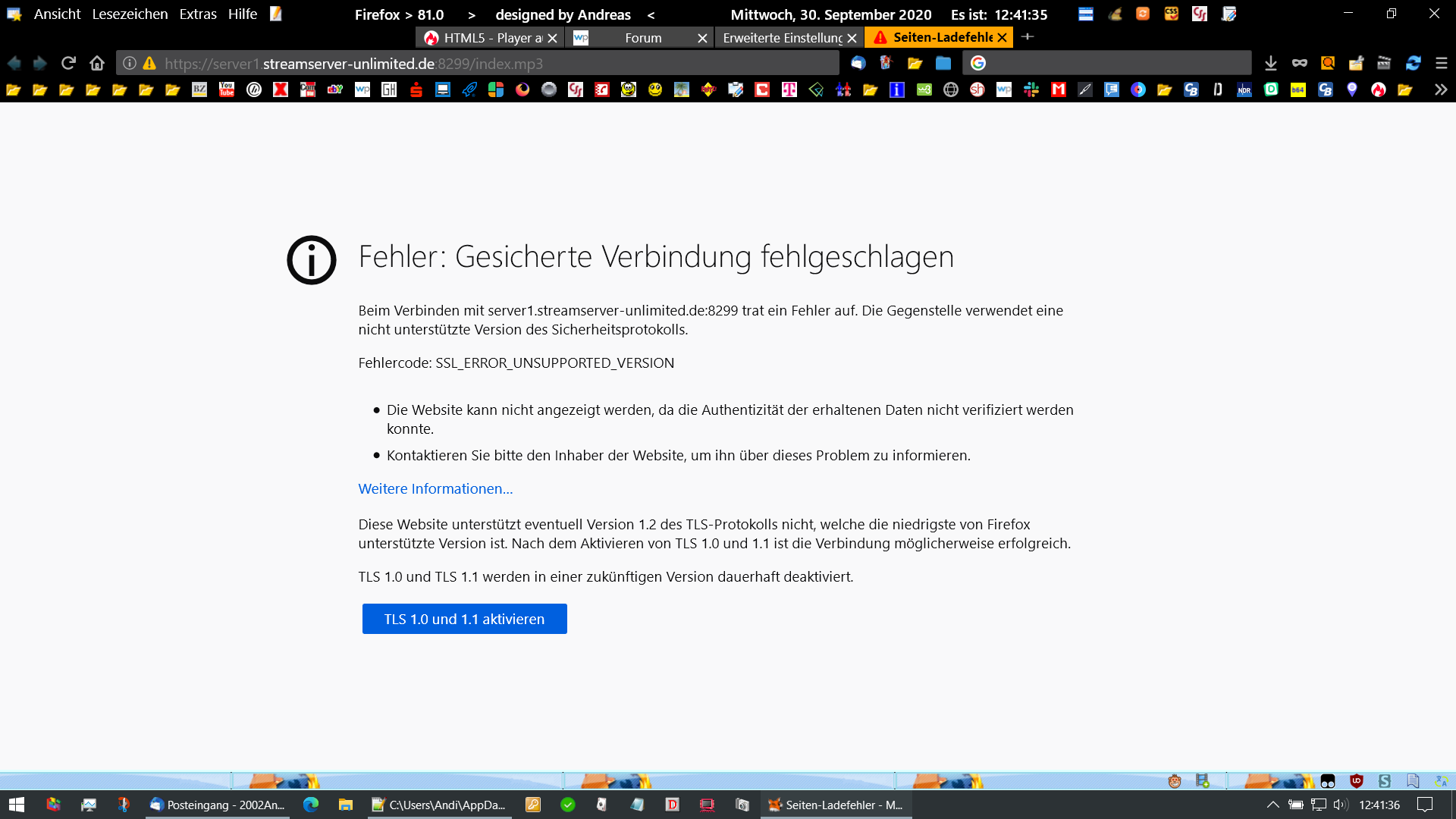 Selbst wenn ich in Firefox dieses TLS zulasse gibts 400 Serverfehler