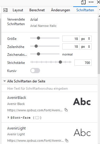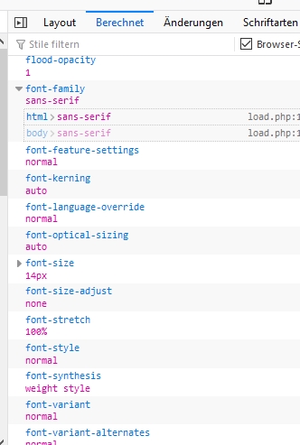 • Zumindest sehen wir, dass die Schrift nicht via CSS an irgendeiner Stelle überschrieben wird und tatsächlich sans-serif Anwendung findet. Den Schriftarten-Reiter hattest du ja schon gefunden. Was zeigt der für eine verwendete Schriftart an? Auch hier bitte wieder wirklich beim Element, welches falsch dargestellt wird.