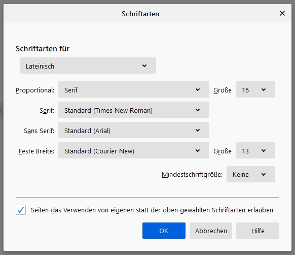 Ich kann aber auch nicht sagen, welches "sans-serif" geladen wird. In Firefox steht als Auswahl für "Sans Serif" "Arial" drin. (nicht verändert). Also wenn es nicht Firefox ist (siehe oben), dann ist bei ihm Arial defekt.