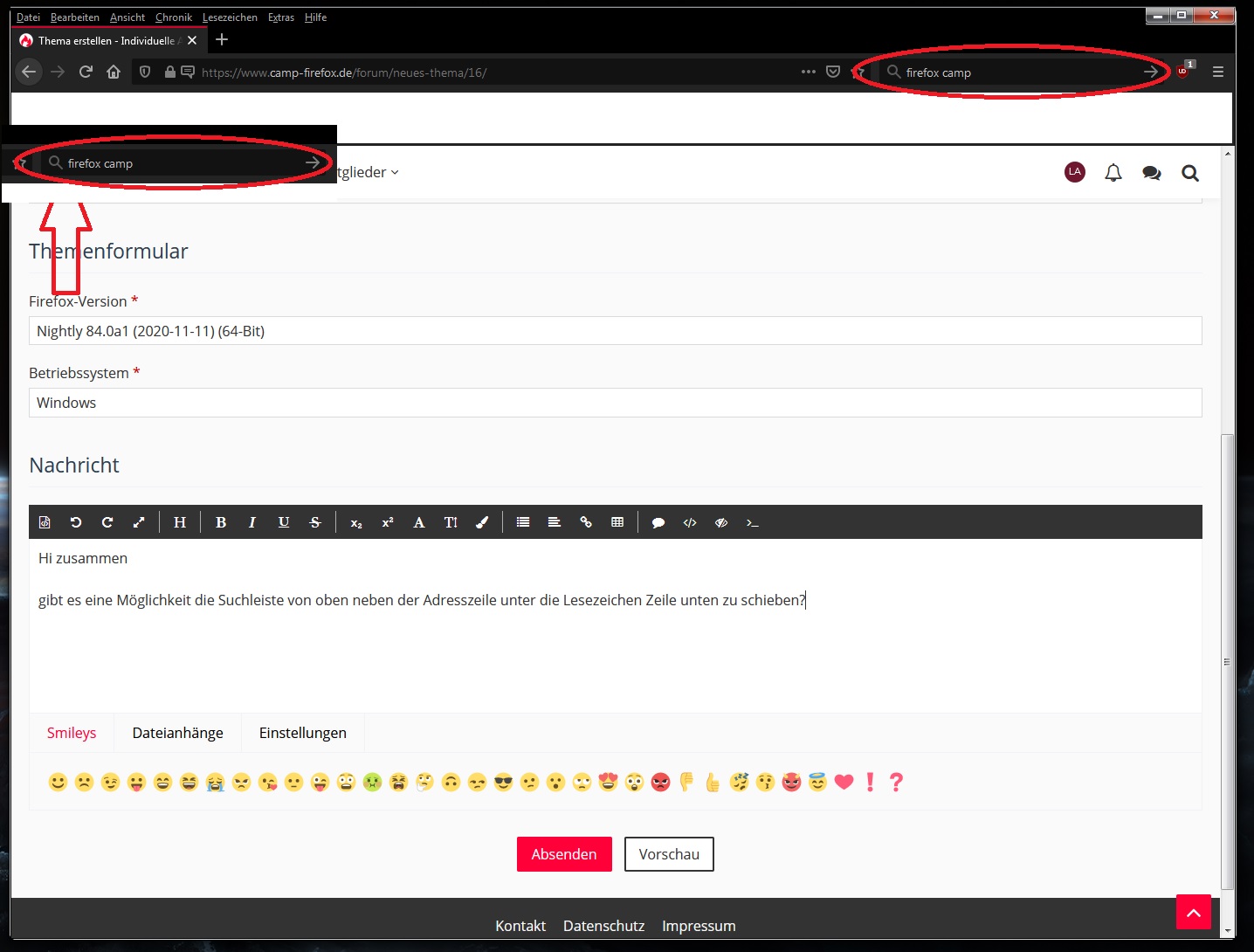 gibt es eine Möglichkeit die Suchleiste von oben neben der Adresszeile unter die Lesezeichen Zeile unten zu schieben? ( so wie auf den Bild zu sehen )