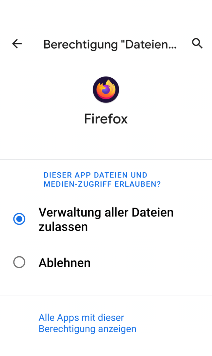 Der Anhang zeigt den Balken oben, nachdem im Firefox der Link zur PDF angeklickt wurde. Dabei bleibt es dann aber auch. Beim Chrome reicht dagegen ein Klick und ich sehe die PDF im Browser und bei Bedarf in der Files-App.