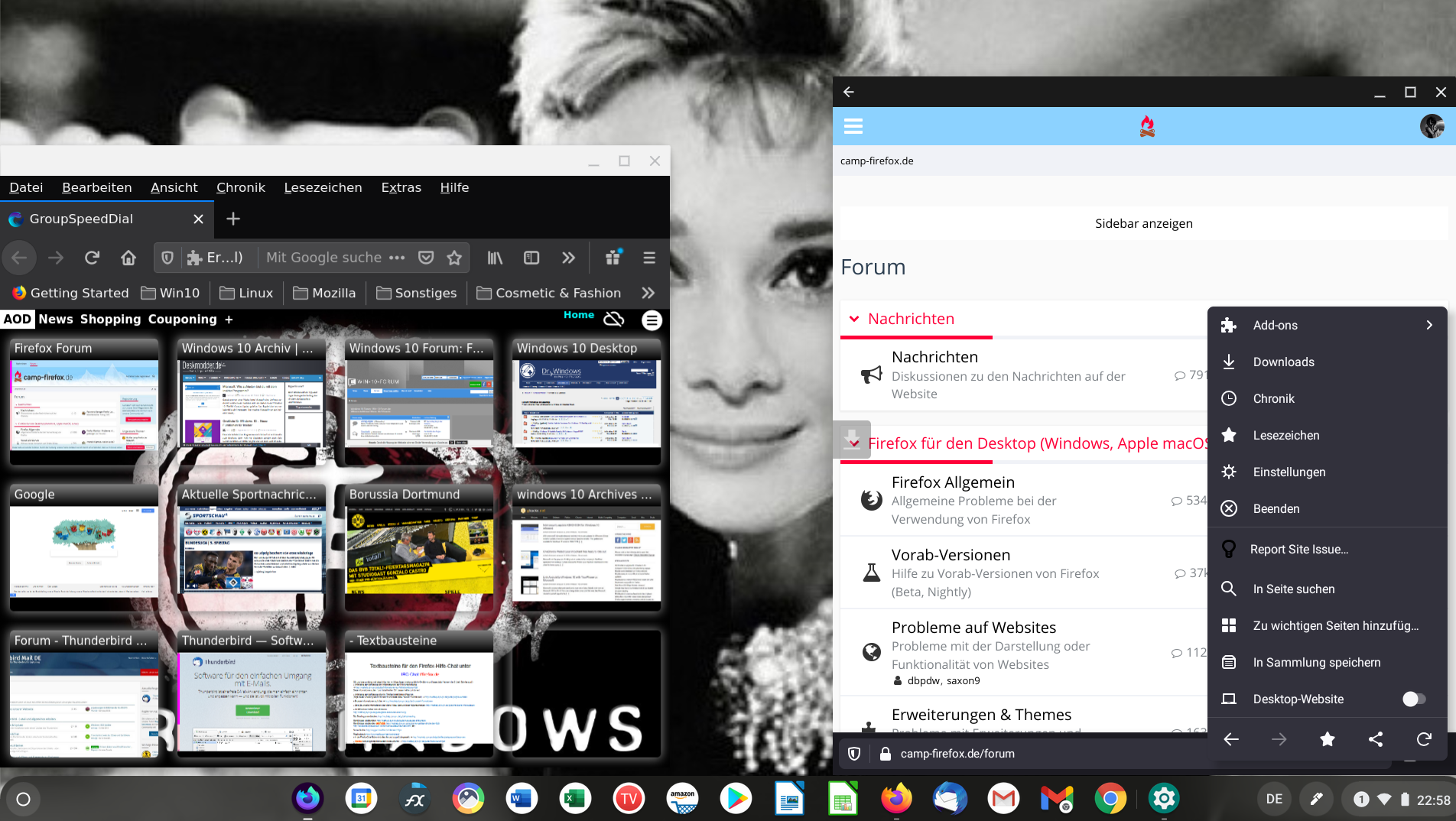 . Das was man auf dem Screenshot sieht ist der Desktop von Chrome OS. Links dann der Firefox (Fenix) Nightly für Android und rechts der Firefox Browser unter Linux (Penguin). -