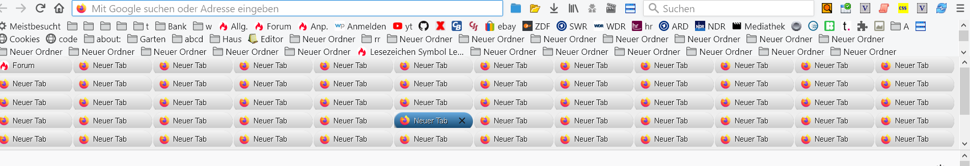 Meine userChrome.css Datei enthält jetzt nur noch den Code für die mehrzeilige Symbolleiste und die mehrzeilige Tableiste kommt komplett aus den Script. Die Doppelungen, von denen Andreas gestern gesprochen hatte, wären damit also raus, und das Ganze ist schön ordentlich.