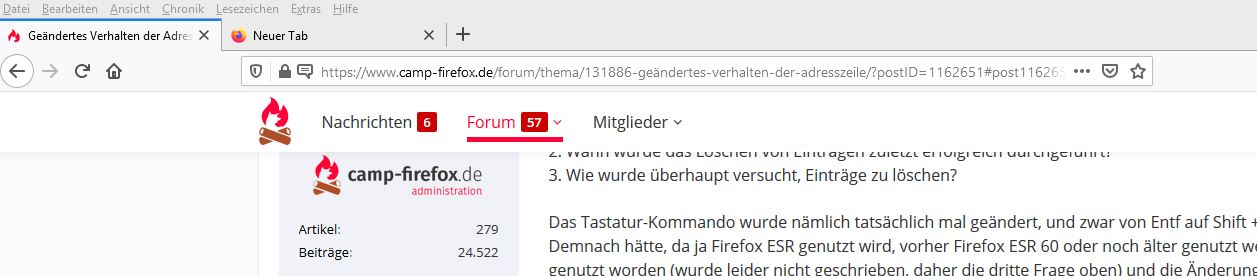 Mit dem letzten Update (78.6.1) ist scheinbar die Möglichkeit verloren gegangen, Einträge aus der Adressleiste zu löschen. Ein Feature, was gelegentlich ganz nützlich ist, um unerwünschte URLs zu löschen oder Platz für häufig genutzte URLs zu schaffen.