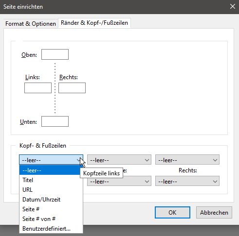 • Nochmal zum Thema: Es geht um die eigenen Einstellungsmöglichkeiten der Zeilen in jeder der 4 Ecken eines zu druckenden Dokumentes - ob man z.B. die Seitenzahl oben rechts, oder die URL unten links ausgedruckt haben möchte und die nicht erwünschten Angaben einfach nicht gedruckt werden