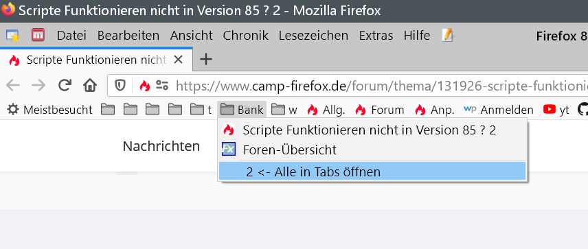 Alles anzeigen(function() { if (!window.gBrowser) return; function setFunction() { PlacesViewBase.prototype._mayAddCommandsItems = function PVB__mayAddCommandsItems(aPopup) { if (aPopup == this._rootElt) return; let hasMultipleURIs = false; if (aPopup._placesNode.childCount > 0) { let currentChild = aPopup.firstElementChild; let numURINodes = 0; while (currentChild) { if (currentChild.localName == "menuitem" && currentChild._placesNode) { if (++numURINodes == 2) break; } currentChild = currentChild.nextElementSibling; } hasMultipleURIs = numURINodes > 1; } if (!hasMultipleURIs) aPopup.setAttribute("nofooterpopup", "true"); else aPopup.removeAttribute("nofooterpopup"); if (!hasMultipleURIs) { if (aPopup._endOptOpenAllInTabs) { aPopup.removeChild(aPopup._endOptOpenAllInTabs); aPopup._endOptOpenAllInTabs = null; aPopup.removeChild(aPopup._endOptSeparator); aPopup._endOptSeparator = null; } } else if (!aPopup._endOptOpenAllInTabs) { aPopup._endOptSeparator = document.createXULElement("menuseparator"); aPopup._endOptSeparator.className = "bookmarks-actions-menuseparator"; aPopup.appendChild(aPopup._endOptSeparator); aPopup._endOptOpenAllInTabs = document.createXULElement("menuitem"); aPopup._endOptOpenAllInTabs.className = "openintabs-menuitem"; if (typeof this.options.extraClasses.entry == "string") { aPopup._endOptOpenAllInTabs.classList.add( this.options.extraClasses.entry ); } if (typeof this.options.extraClasses.footer == "string") { aPopup._endOptOpenAllInTabs.classList.add( this.options.extraClasses.footer ); } aPopup._endOptOpenAllInTabs.setAttribute( "oncommand", "PlacesUIUtils.openMultipleLinksInTabs(this.parentNode._placesNode, event, " + "PlacesUIUtils.getViewForNode(this));" ); aPopup._endOptOpenAllInTabs.setAttribute( "onclick", "checkForMiddleClick(this, event); event.stopPropagation();" ); let menuitemsCount = 0; for (let node of aPopup.childNodes) { if (node.localName == 'menuitem') menuitemsCount++; } aPopup._endOptOpenAllInTabs.setAttribute( "label", " " + menuitemsCount + " <- " + gNavigatorBundle.getString("menuOpenAllInTabs.label") ); aPopup.appendChild(aPopup._endOptOpenAllInTabs); } } } let intID = setInterval(function() { if (window.PlacesViewBase) { clearInterval(intID); setFunction(); } }, 500); })(); -
