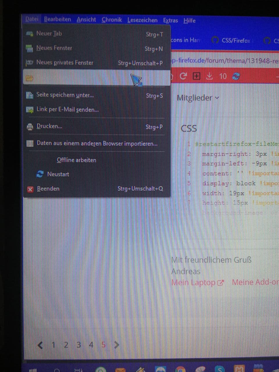 Ich will dann auch auf Aris’ Skripte in der Sammlung Aris-t2/CustomJSforFx hinweisen (die dort aufgeführte Methode 2 ist im Prinzip die hier im Forum übliche): CustomJSforFx/restart_button.uc.js und CustomJSforFx/restart_item_in_menu.uc.js, beachte bei letzterem die Variablen menuicon und appmenuicon.