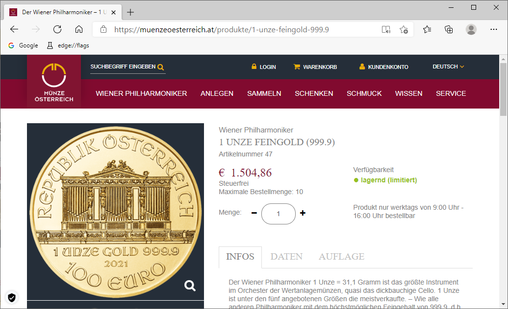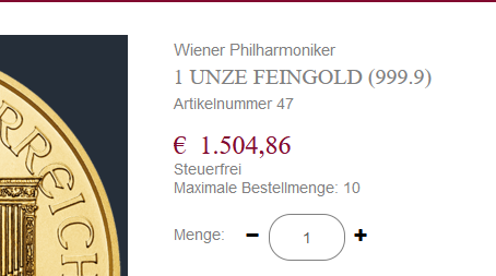 Der Preis für eine Münze wird nur beim Firefox unter Windows 10 sowie Android nicht korrekt angezeigt (1.516,69 EUR), beim Internet Explorer und Edge Chromium allerdings korrekt (1.504,86 EUR). Seitenaktualisierungen bringen keine Abhilfe. Vorhin habe ich beim Firefox Daylight alle Browserdaten bis auf die offenen Tabs gelöscht - ebenfalls keine Änderung.