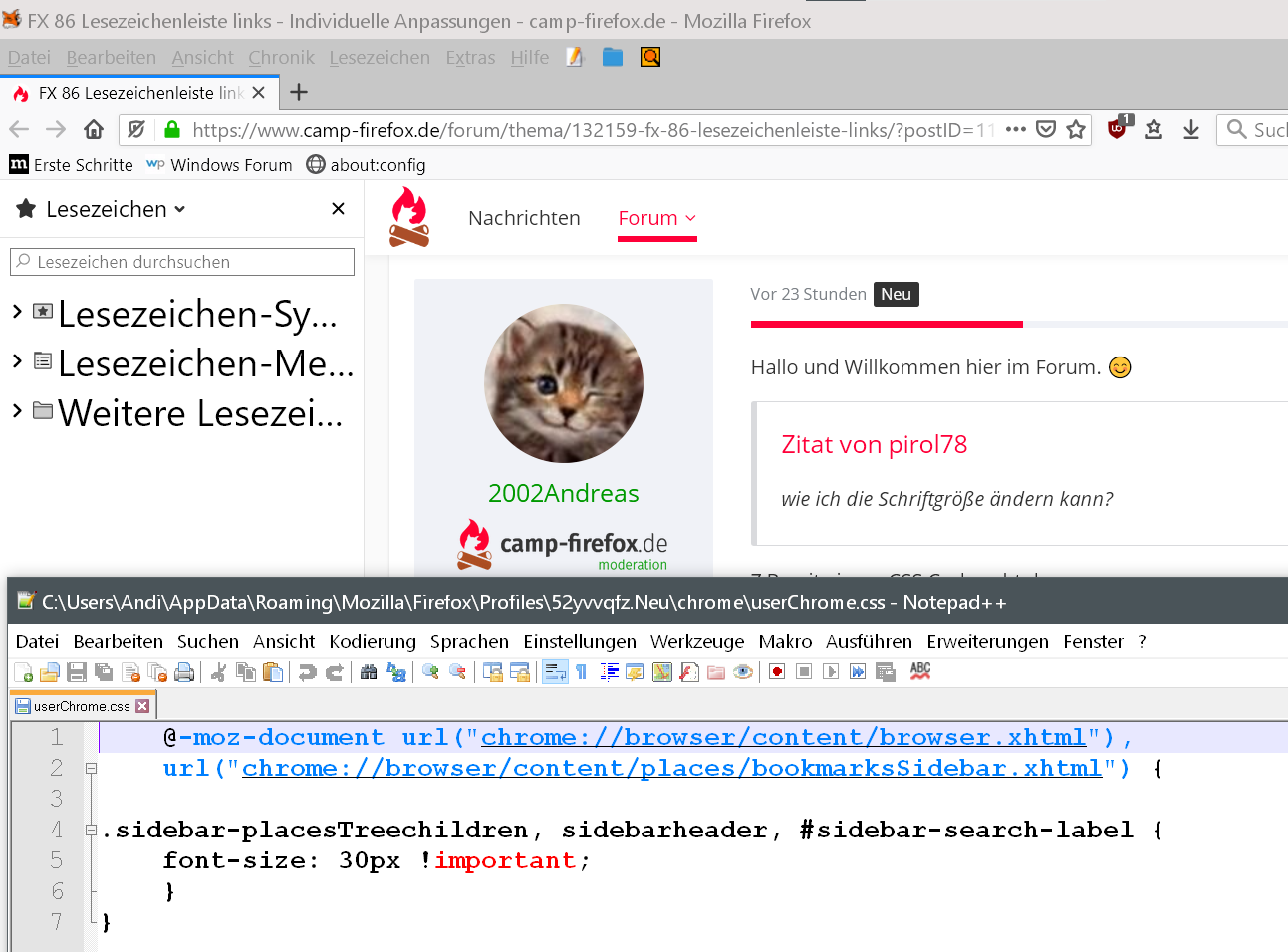 Nach der Einrichtung des Browsers möchte ich jetzt die Schriftgröße der Lesezeichenleiste ändern.