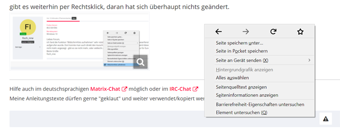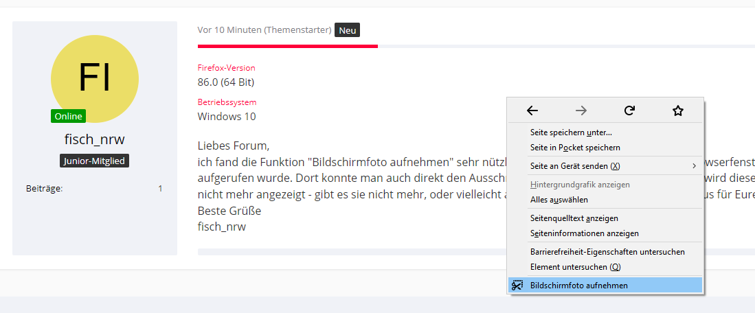 ich fand die Funktion "Bildschirmfoto aufnehmen" sehr nützlich, die bisher durch Anklicken des Browserfensters mit der rechten Maustaste aufgerufen wurde. Dort konnte man auch direkt den Ausschnitt festlegen. Seit dem letzten Update wird diese Funktion im Kontextmenü nicht mehr angezeigt - gibt es sie nicht mehr, oder vielleicht an anderer Stelle? Vielen Dank im Voraus für Eure Hilfe.