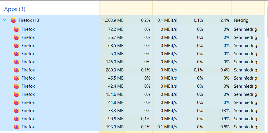 milupo: ich hatte nur 2 Tabs offen, die FF nach der Neuinstallation angezeigt hat, trotzdem waren 12 Prozesse offen.