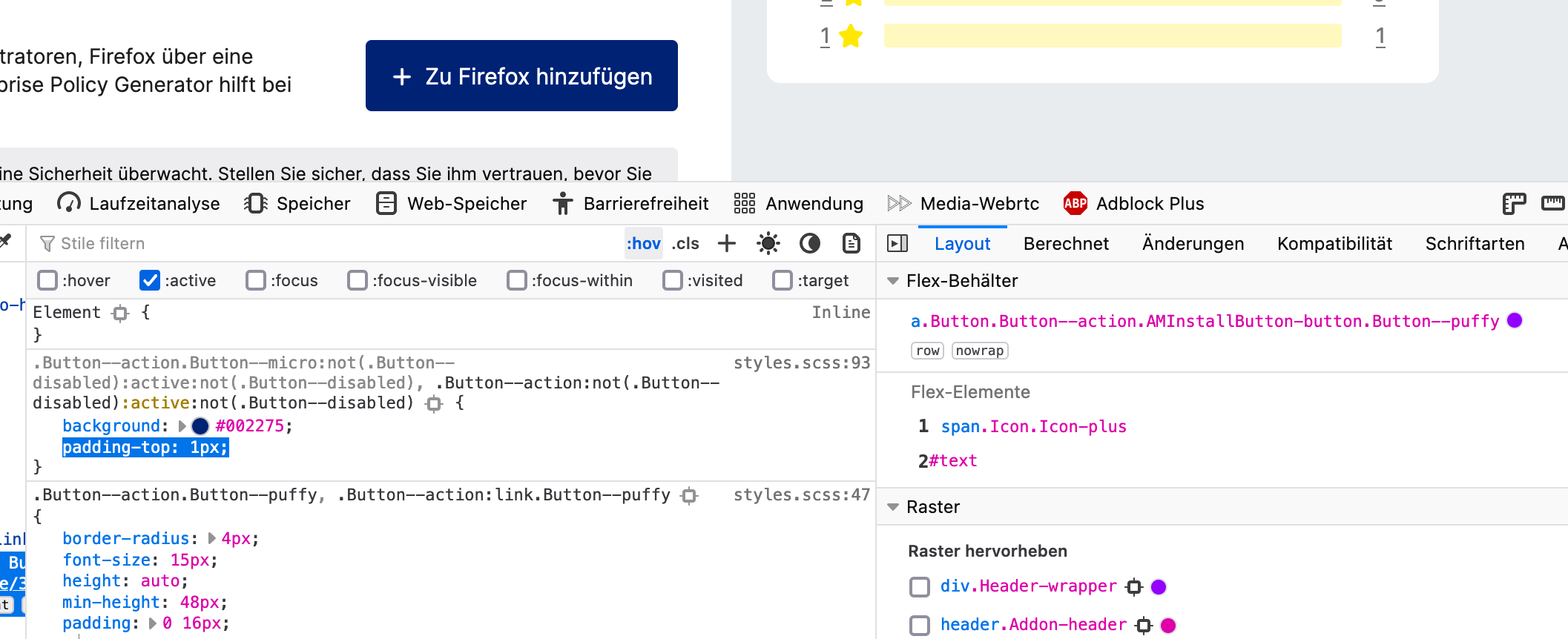 Beim Installieren von AddOns unter Firefox ist mir aufgefallen, dass bei manchen AddOns beim Button '+ Zu Firefox hinzufügen' beim on-Click die Schrift ein paar wenige Milli nach unten rutscht und bei einigen AddOns nicht.