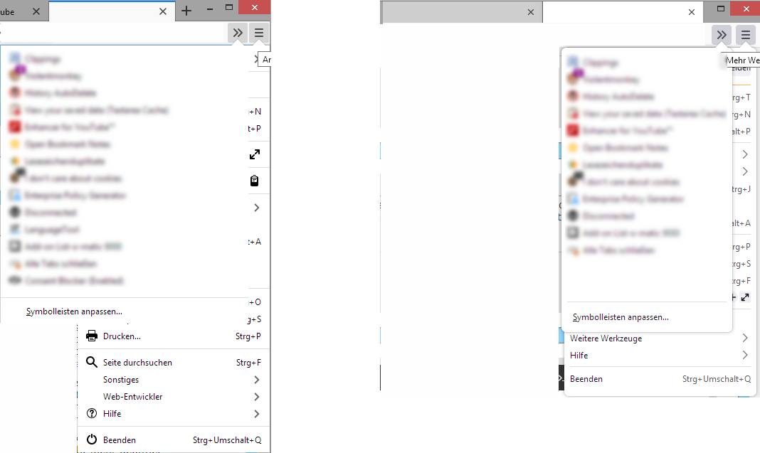 Ich habe heute meine Nightly im Menü bereinigt (via prefs) und etliche Einträge aus nicht mehr vorhandenen Erweiterungen gelöscht. Danach die vorhandenen Buttons neu sortiert.