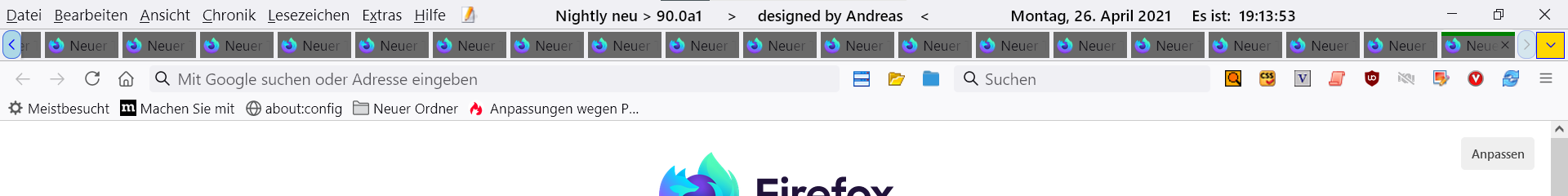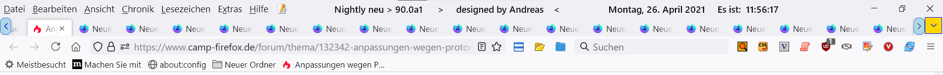 • In Firefox 88 wurde an der Tableiste überhaupt nichts für den Nutzer sicht- und spürbar verändert und wenn deine Kontextmenüs "kaputt" sind, liegt das auch einzig und alleine an deinen Anpassungen. Ein Neustart-Button ist ebenfalls eine individuelle Anpassung, mit der Mozilla nicht das Geringste zu tun hat. Mit anderen Worten: Deine Probleme haben ihren Ursprung komplett in deinen persönlichen Anpassungen. Wer sowas nutzt, muss immer damit rechnen, dass Adaptierungen notwendig werden. Die Aussage "Ich bin grad geschockt was da wieder verb... äh modernisiert wurde" ist jedenfalls völlig deplatziert, da alle von dir beschriebenen Probleme hausgemacht und nicht Mozillas Schuld sind. Ein Firefox, an dem nicht selbst rumgepfuscht wurde, funktioniert auch nach dem Update auf Version 88 einwandfrei. Und ja, wenn deine Anpassungen jetzt schon Probleme machen, dann rechne mit Firefox 89 mit weiteren Problemen. Dann kommen schließlich erst die großen Veränderungen.
