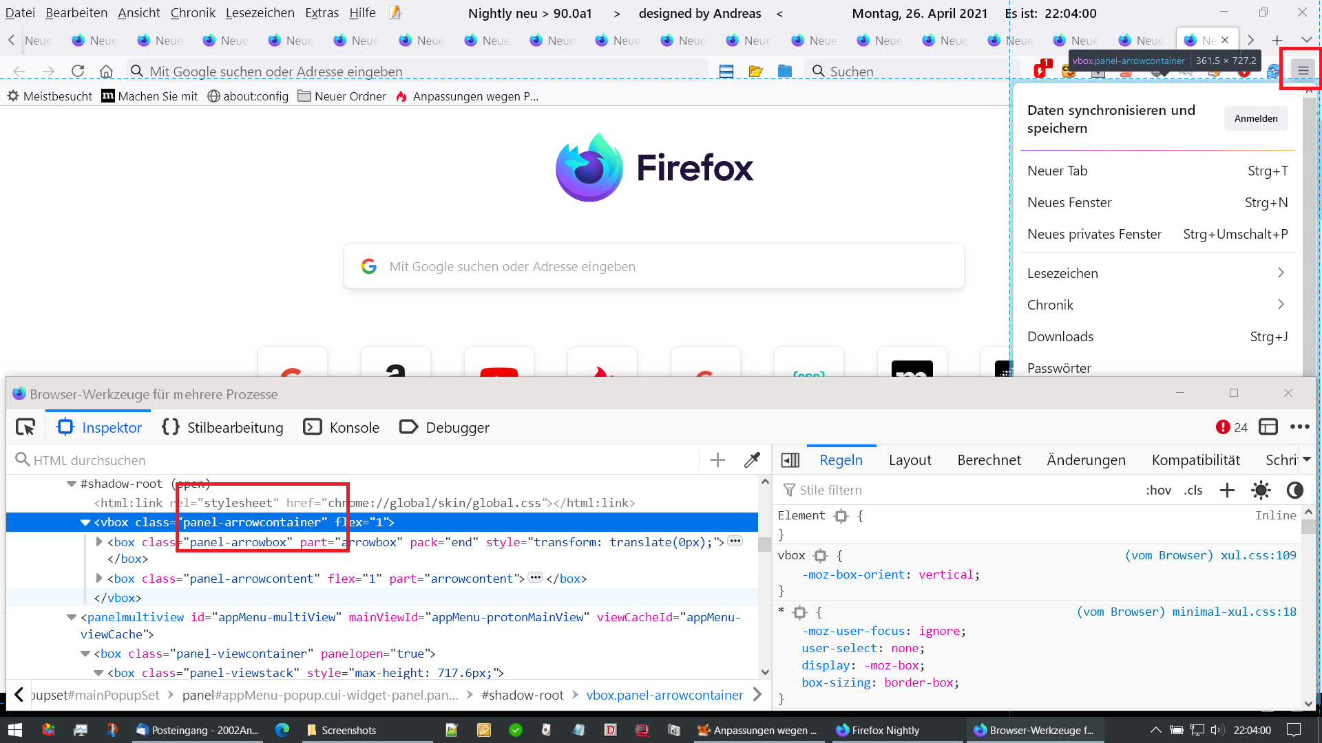 Mal in die Runde gefragt: gehen die Anpassungen mit Firefox 89 dort weiter wo sie gerade mit Version 88 wieder angefangen haben? Ich bin grad geschockt was da wieder verb... äh modernisiert wurde. Tableiste verschoben, Kontextmenü kaputt, Restartbutton weg .... Bevor ich hier jetzt für den 88er nach Hilfe ersuche und mich in Beschäftigungstherapie ergehe, warte ich dann lieber bis sich der Staub gelegt hat (bis zur Version 89?!) und baue dann um.