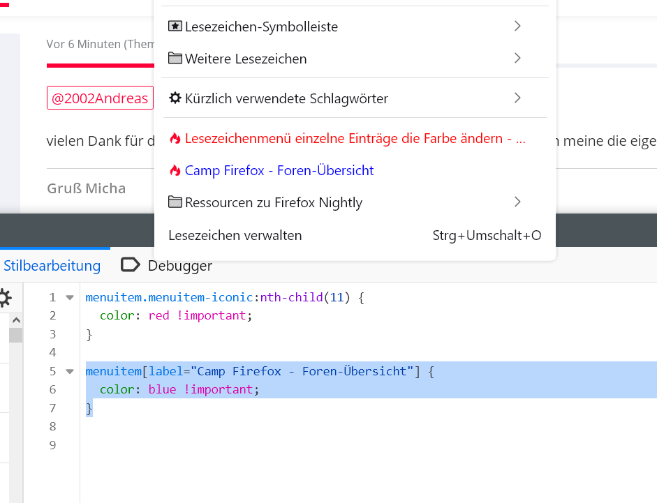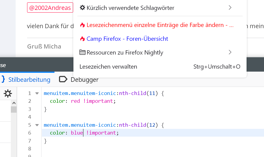 Kann mir jemand von Euch den Einstieg zeigen wie ich im Lesezeichenmenü einzelne Einträge die Farbe ändern kann ?