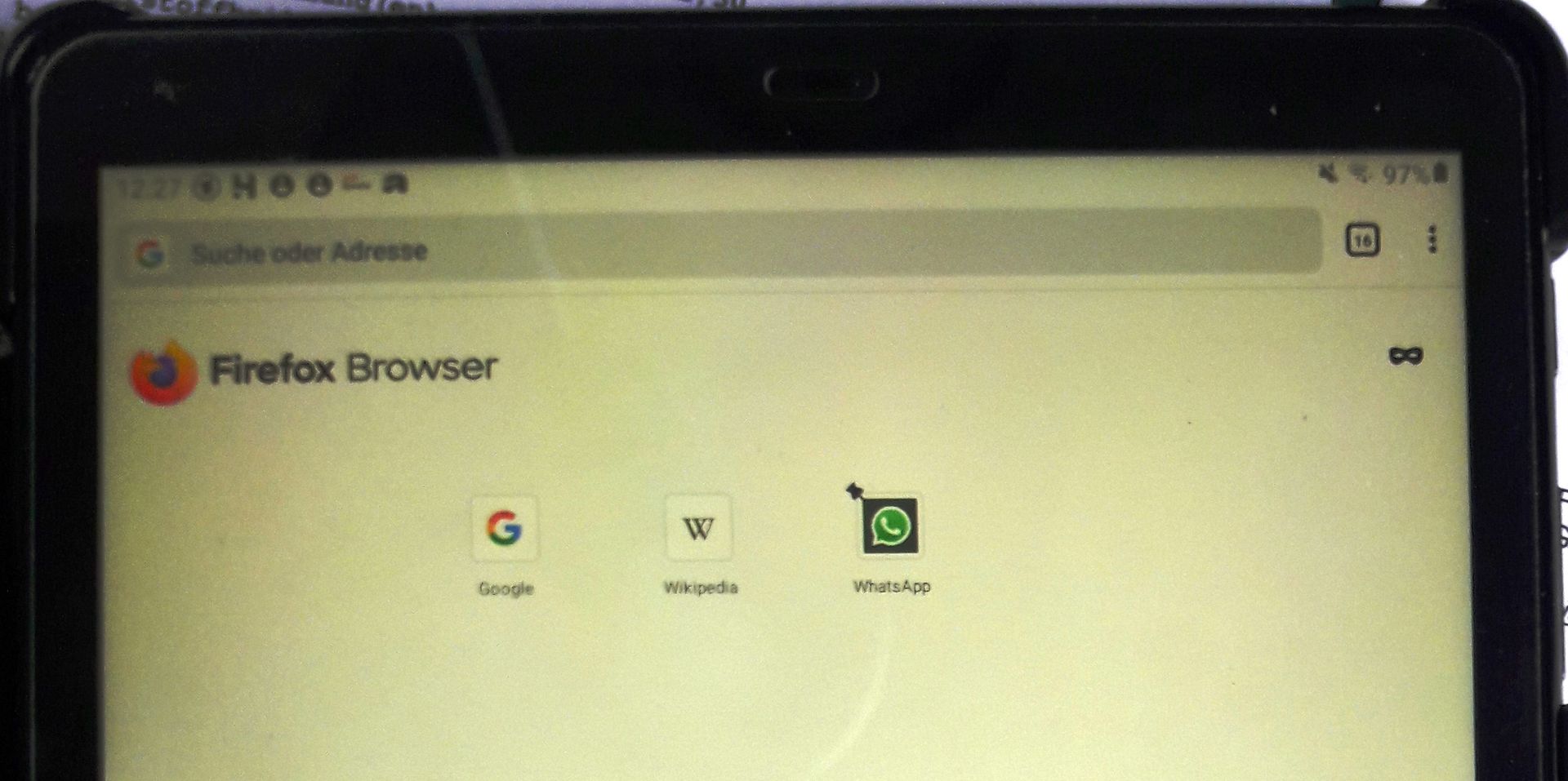 sowohl auf meinem Tablet (Galaxy Tab A 10.5) als auch auf meinem Smartphone (Galaxy A3 2016) finde ich kein Icon für die Startseite von Firefox (siehe Anhang), wie sie in der PC Version vorhanden ist. Um auf die Startseite zu kommen, muss ich mehrfach die Backtaste drücken und durch alle zwischenzeitlich geöffneten