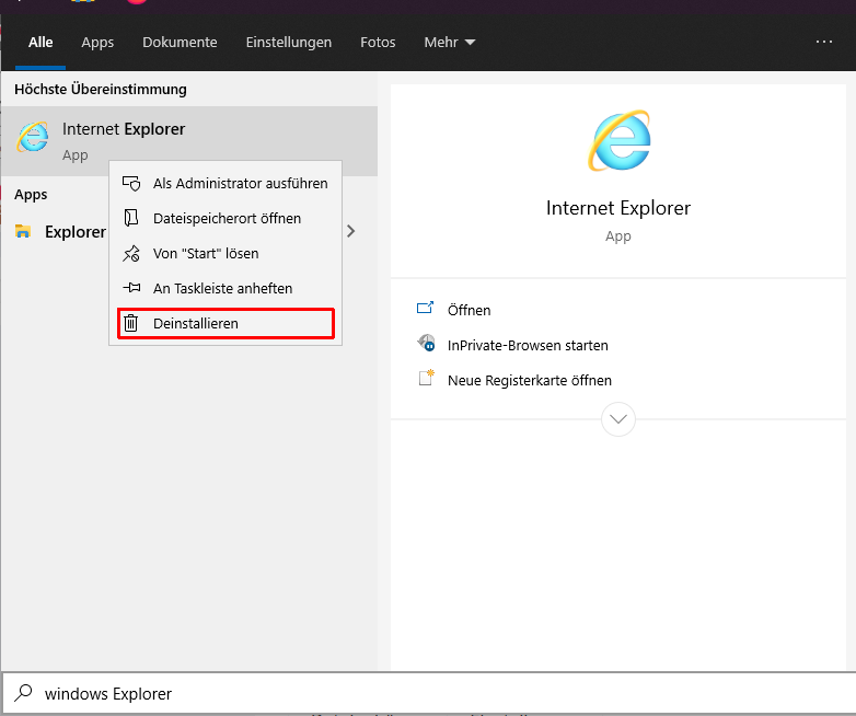 • Wenn man die Windowstaste drückt und dort Internet Explorer eingibt und dann einen Rechtsklick auf die App macht und es wird einem der "Deinstallieren" Button angeboten, dann kann man ihn auch deinstallieren.