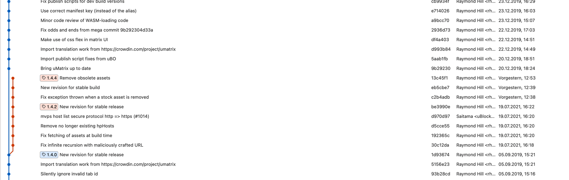 Ich will natürlich nicht ausschließen, dass die Versionen falsch getaggt sind und dass er versehentlich als Version 1.4.2 entwas veröffentlichte, was aus dem anderen Zweig stammt.
